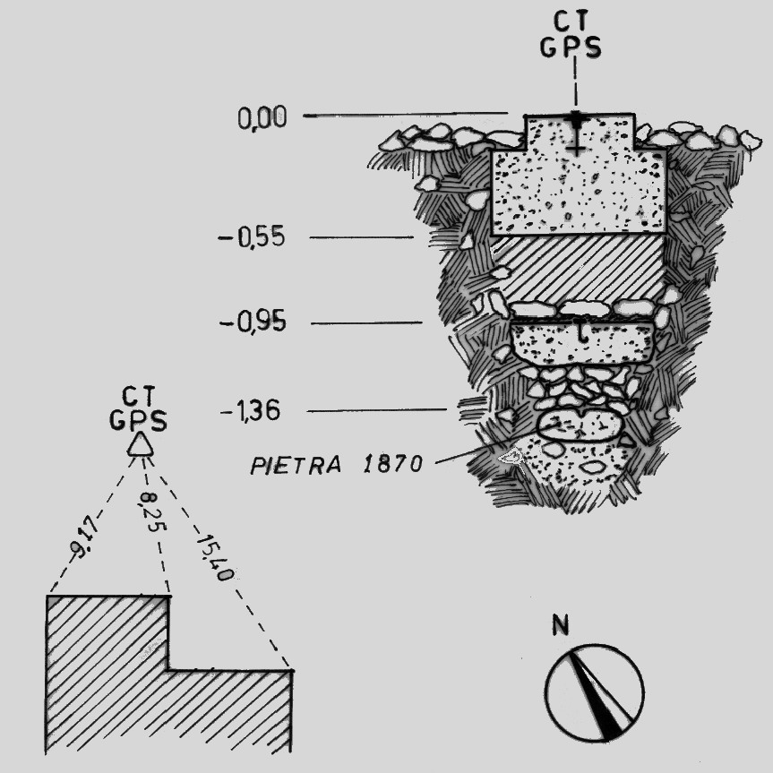 | materializzazione | Centrino del tipo "GPS A" incollato su centrino di superficie costituente la materializzazione insieme ai sottostanti e coassiali centrino di profondità e pietra con croce incisa recante la scritta "1870". |