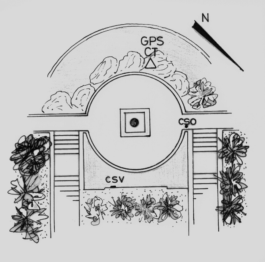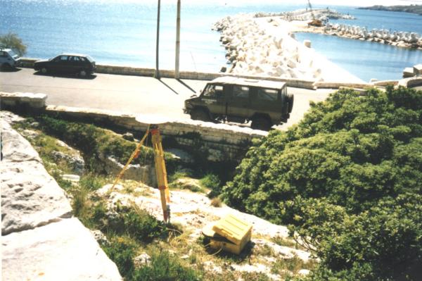 Centrino del tipo "GPS C" fissato su roccia affiorante davanti all'opera terminale dell'Acquedotto Pugliese tra la cascata finale e il parcheggio.