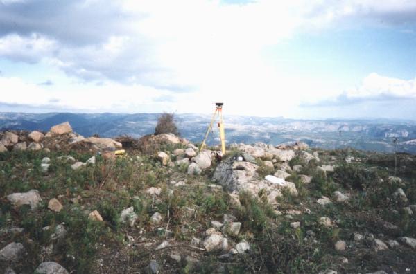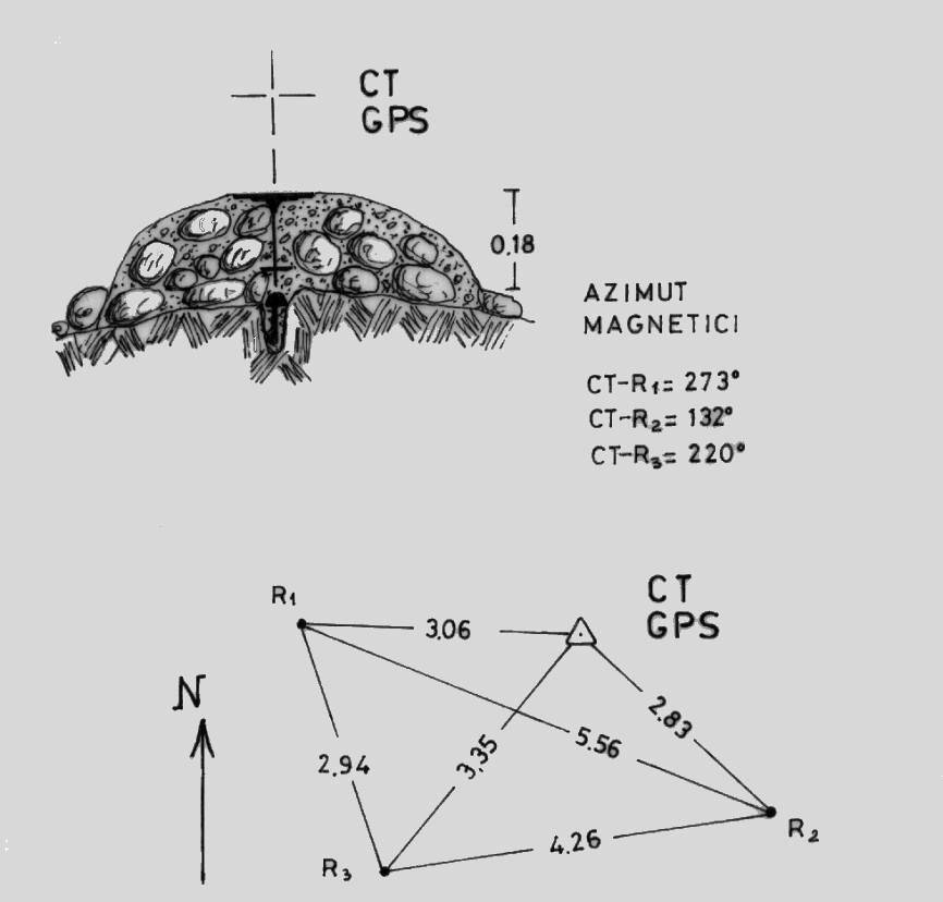 | materializzazione | Centrino di tipo "GPS A" infisso in centrino IGM del tipo di superficie cementato in asse a sottostante bulloncino di acciario inox fissato su roccia. Rifermenti: R1, R2, R3, centrini metallici. |