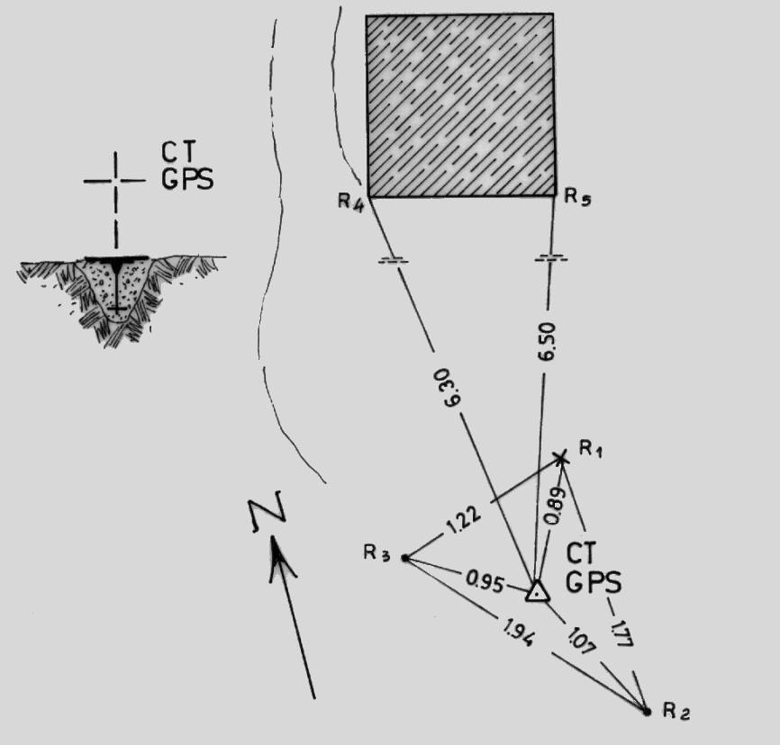 | materializzazione | Centrino di tipo "GPS A"fissato preesistente centrino IGM del tipo di superficie, cementato su roccia affiorante. Riferimenti: R1 croce incisa su roccia; R2 e R3 centrini metallici; R4 e R5 spigoli del casotto. |
