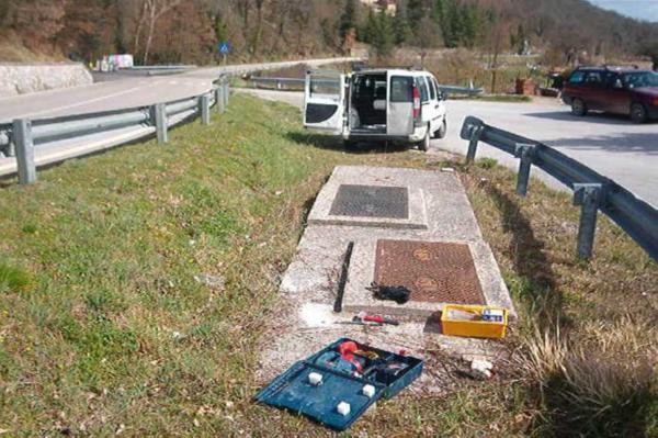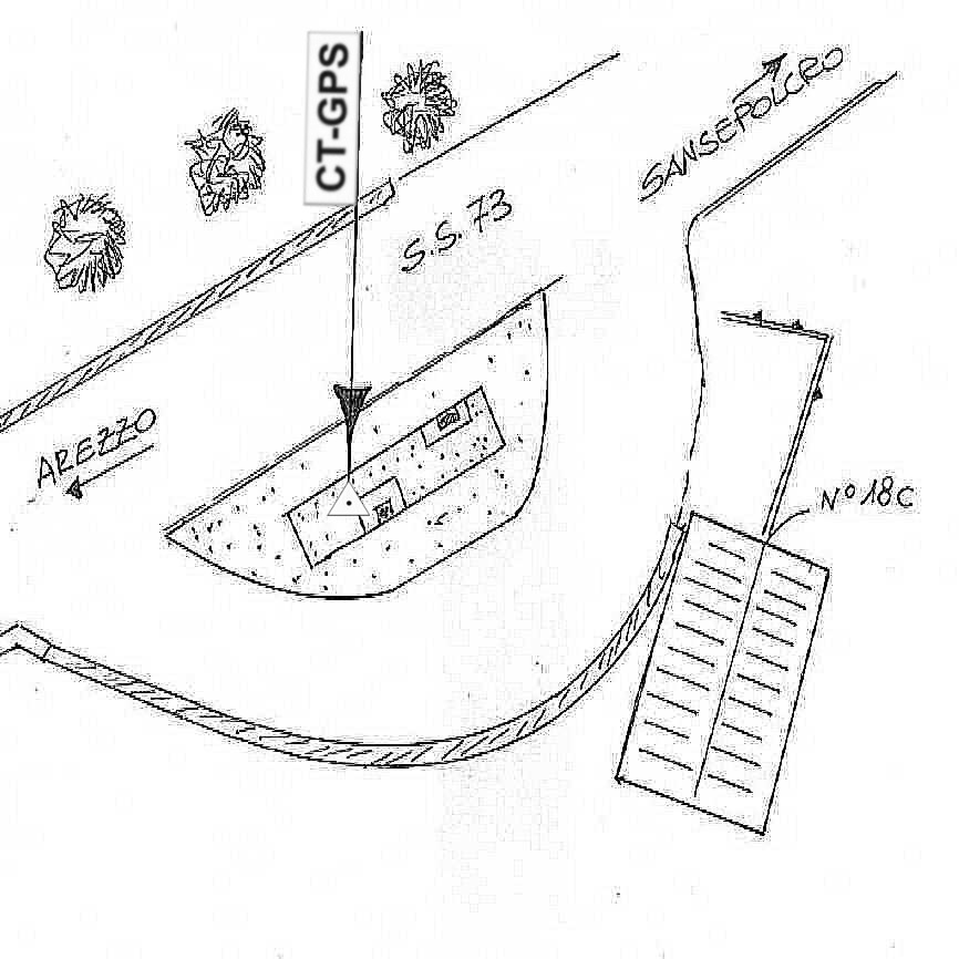 Centrino in acciaio inox murato sulla platea, vicino allo spigolo del tombino, posta sulla vecchia starda S.S. 73 alla progressiva Km 164 + 550, in località " Ca de Bacci ", nel comune di Arezzo.