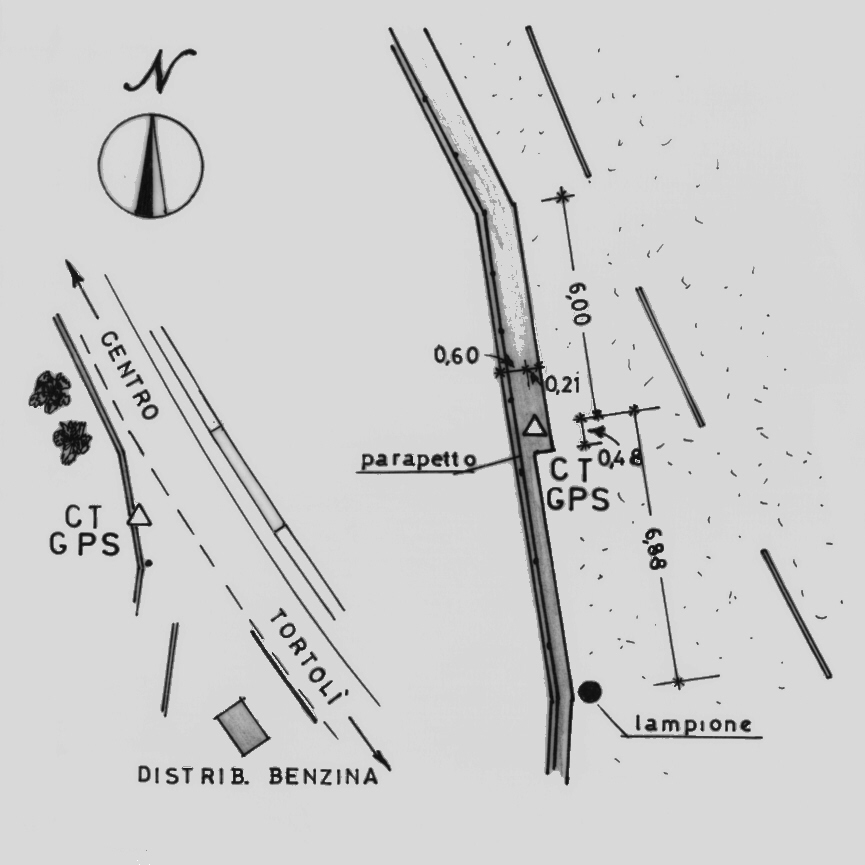 | materializzazione | Centrino del tipo "GPS C" infisso alla sommità del muro a retta in cemento e ai piedi del parapetto in ferro siti lungo il lato ovest della S.S. 125 e immediatamente a nord del distributore di benzina nei pressi del cimitero. |