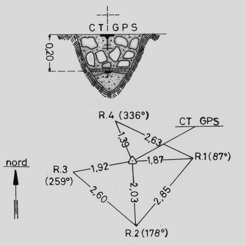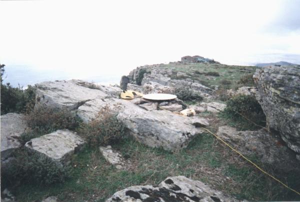 | materializzazione | Centrino del tipo "GPS A" incastonato in centrino IGM del tipo di superficie posto alla sommità del monte. Riferimenti: quattro centrini metallici. (R1=87° – 1,87 m; R2=178° – 2,03 m; R3=259° – 1,92 m; R4=336° – 1,39 m) |