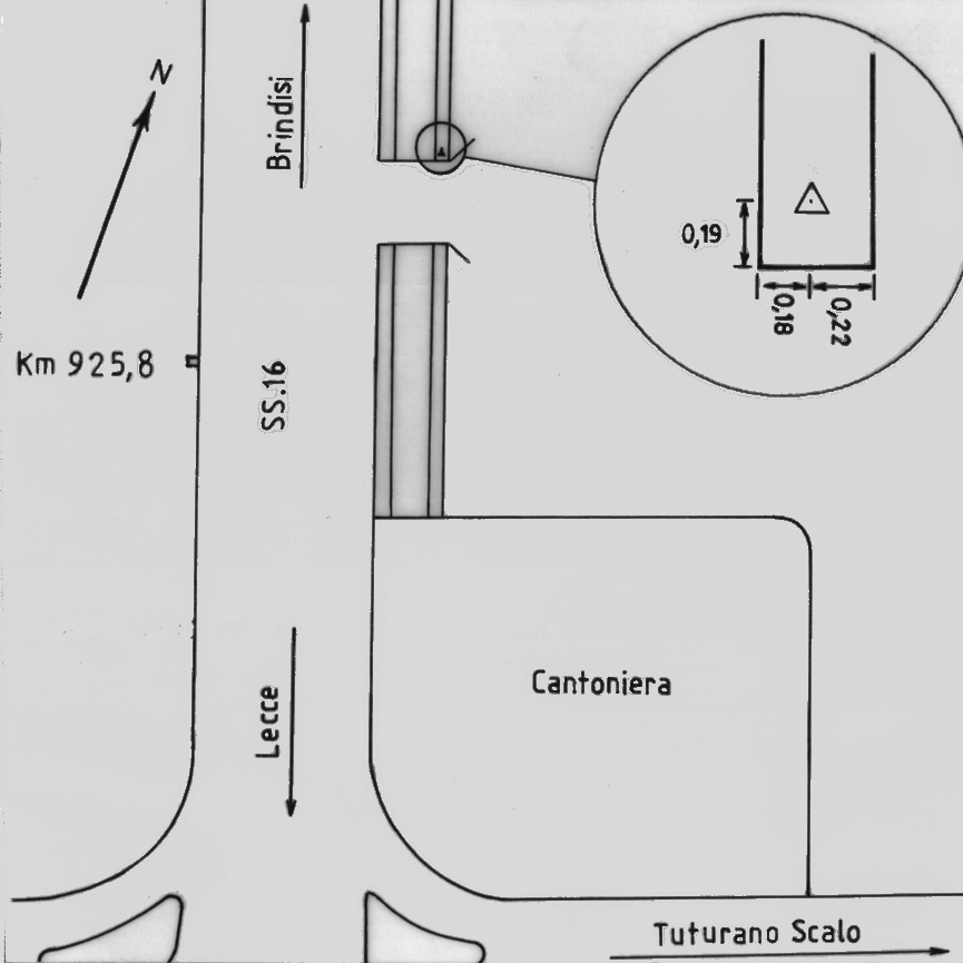 | materializzazione | Centrino di tipo "GPS C" fissato sul muretto al lato est del fosso che costeggia il margine est della SS. 16 al Km 925,800 circa, 50 metri a nord della cantoniera, in corrispondenza di un accesso al campo. |