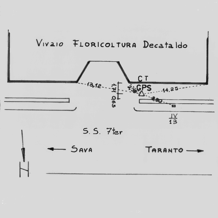 | materializzazione | Centrino del tipo "GPS C" infisso su soletta in cemento, a lato della S.S. 7 ter, del piazzaletto prospicente l'ingresso del Vivaio di floricoltura "De Cataldo". |