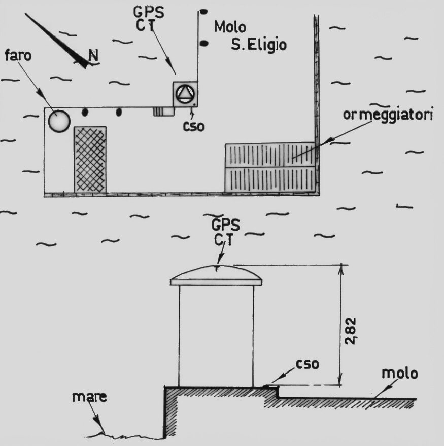 | materializzazione | Centrino di tipo "GPS C" fissato sulla soletta di copertura del casotto mareografico in asse alla stessa. |