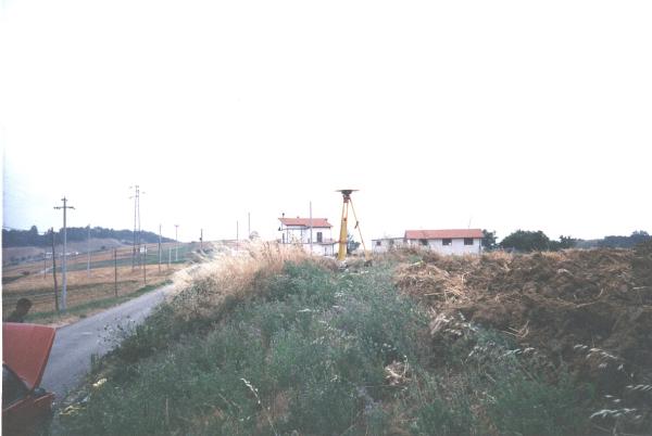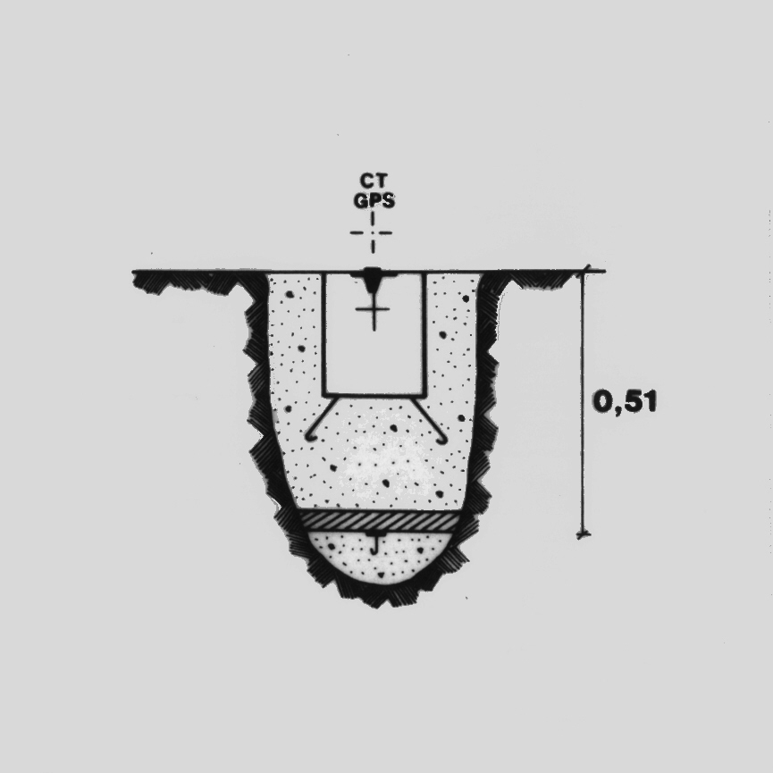 | materializzazione | Centrino del tipo "GPS A" fissato su preesistente centrino IGM del tipo di superficie in blocchetto di calcestruzzo prefabbricato con sottostante centrino di fondo coassiale, posto sul margine nord di una carrareccia adiacente ad un termine di proprietà in pietra. |