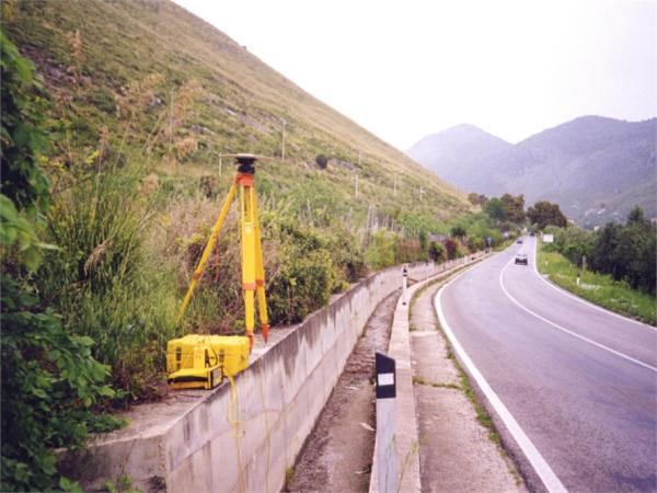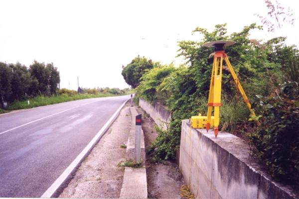 Centrino in acciaio inox del tipo "GPS da livellazione" infisso nella sommità del muro di sostegno esistente sul lato ovest della S.S.7 "Appia" al km 108,900.