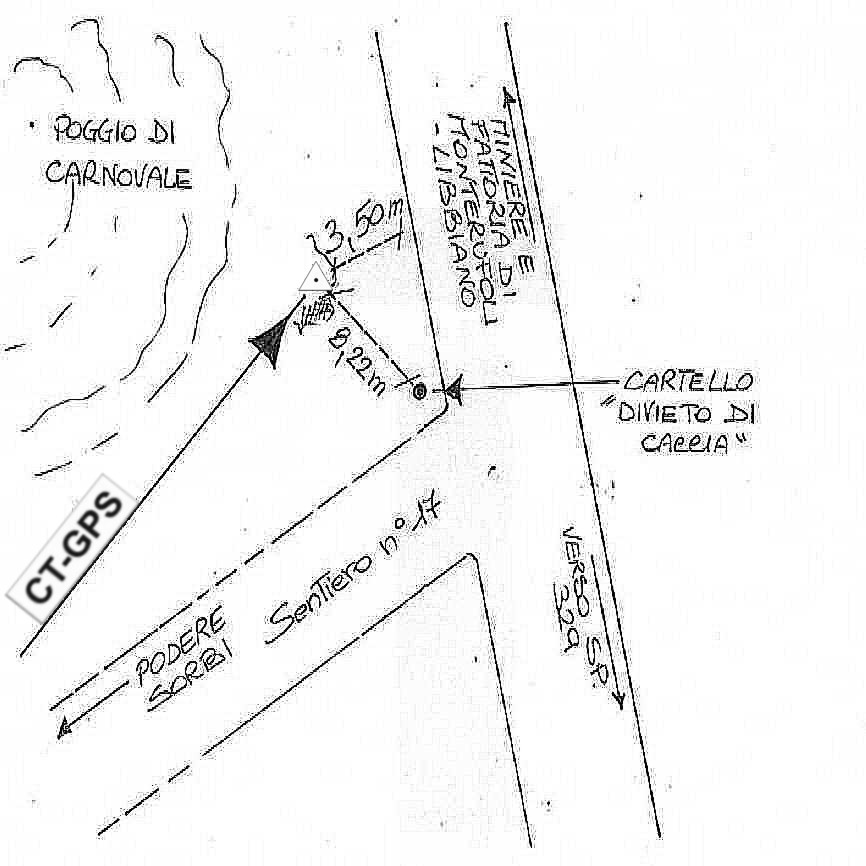 | materializzazione | Centrino in acciaio inox murato su roccia affiorante posta in prossimità del bivio del sentiero n° 17 in località " La Conca di Villetta " nella foresta di Monterufoli. |