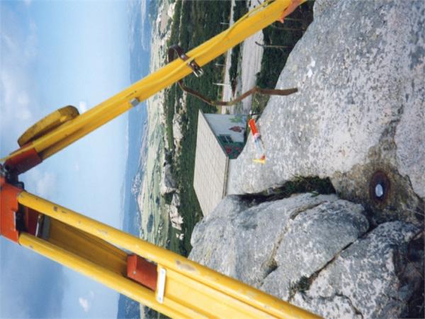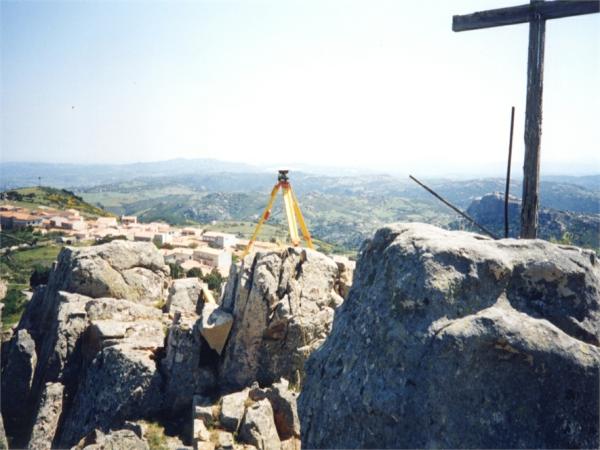 Centrino del tipo "GPS A" fissato su preesistente centrino IGM del tipo di superficie posto su un roccione alla sommità del monte.
