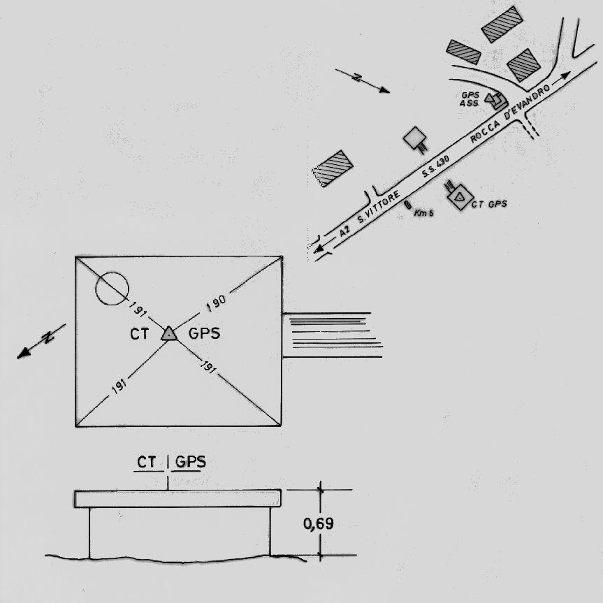 | materializzazione | Centrino di tipo "GPS C" fissato in asse alla soletta di copertura di un pozzetto d'ispezione dell'impianto di irrigazione delle Valli del Pèccia e Garigliano. |