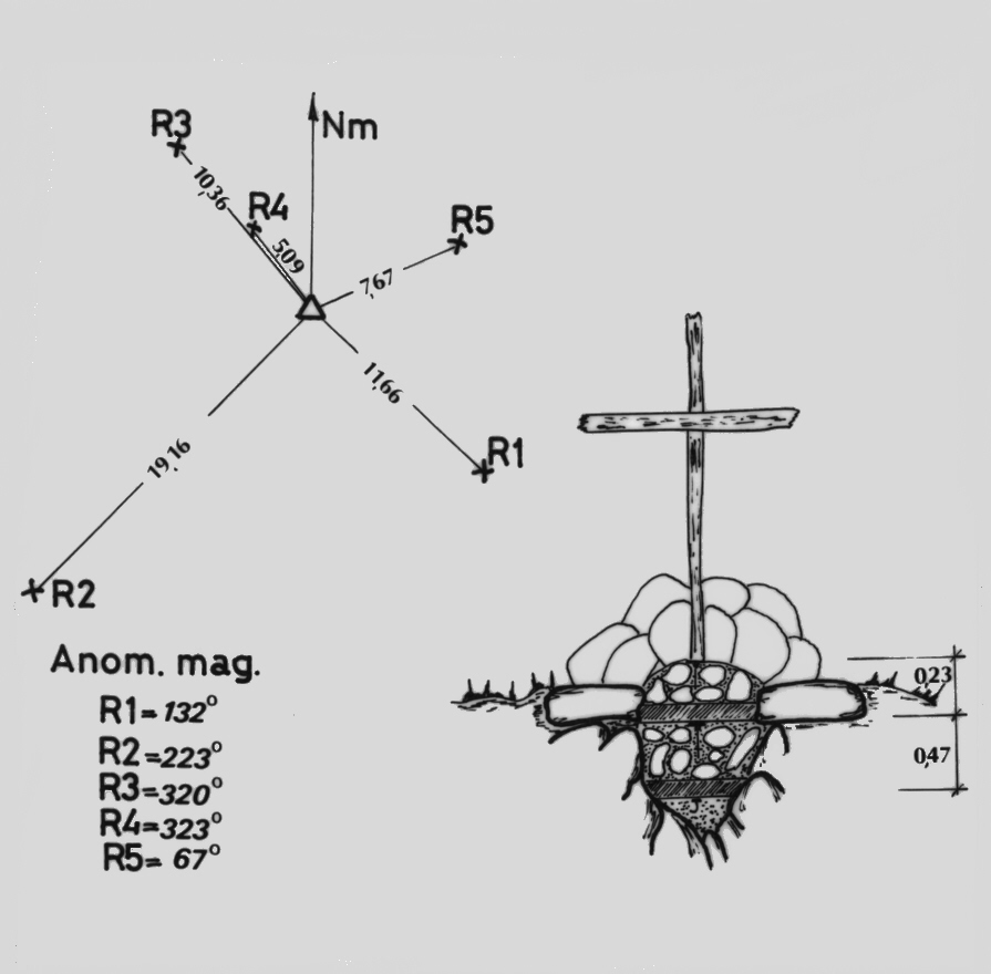 | materializzazione | Centrino di superficie con alloggiato centrino IGM95 del tipo "GPS A" con sottostante centrino di superficie (solo triangolo) e centrino di fondo posti coassialmente tra loro. In asse è posta una croce in legno asportabile. Riferimenti: 5 croci incise. |
