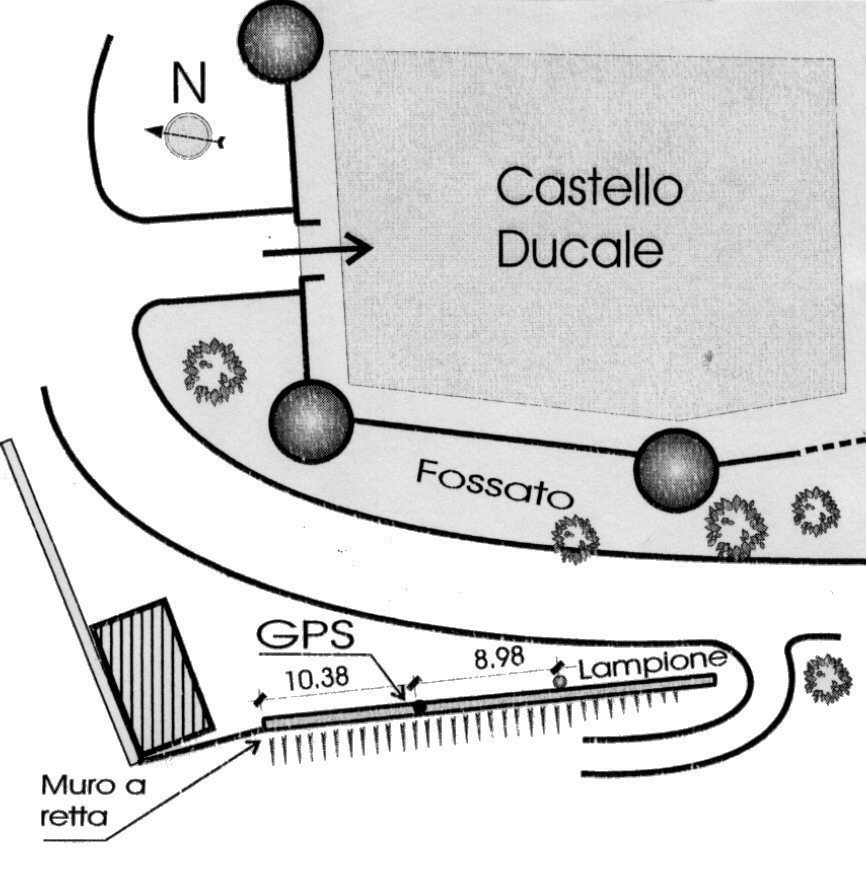 | materializzazione | Centrino in acciaio inox del tipo "GPS da livellazione" infisso alla sommità del muro a retta posto ad ovest dell'ingresso principale del Castello Ducale. |