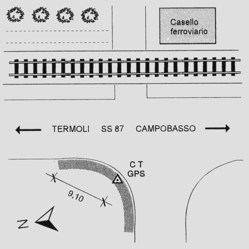 | materializzazione | Bulloncino in acciaio inox da livellazione del tipo GPS infisso nella sommità del cordolo in calcestruzzo esistente sulla curva di destra che delimita l'imbocco di una strada, che si diparte dal margine sinistro della carreggiata per chi procede in direzione di Termoli. |