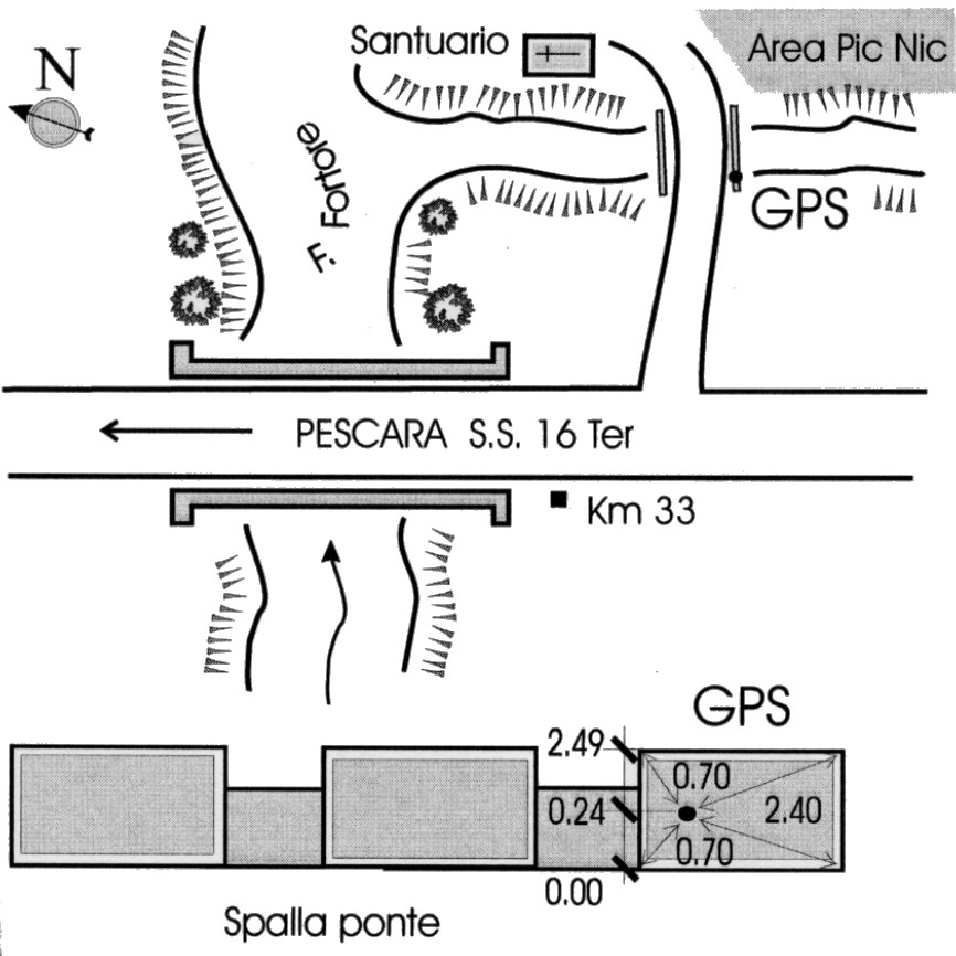| materializzazione | Centrino in acciaio inox del tipo "GPS da livellazione" infisso all'estremità ovest del parapetto sud del ponte che conduce al Santuario "Madonna del Ponte". |