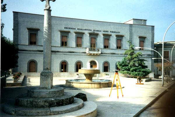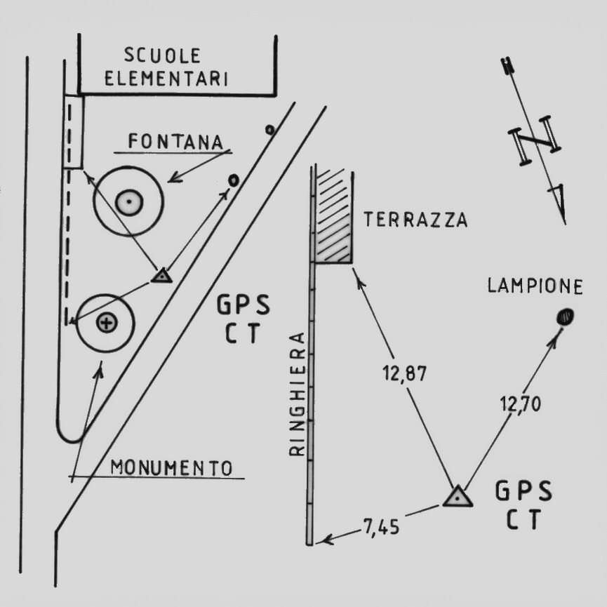 Centrino del tipo "GPS C" fissato nel pavimento di Piazza della Repubblica nel centro del paese, a nord della fontana.