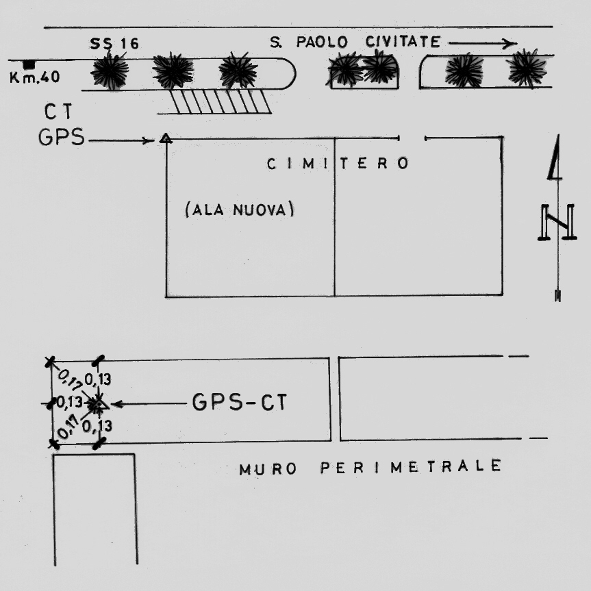 Centrino di tipo "GPS C" fissato alla sommità del muro perimetrale del cimitero in corrispondenza dello spigolo nord-ovest.