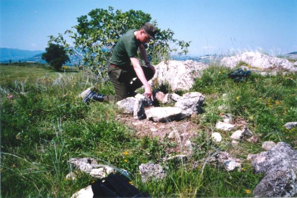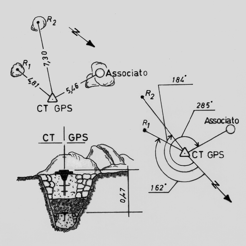Centrino di tipo "GPS A" fissato in asse al centrino di superficie. Riferimenti: R1 e R2 centrini di riferimento infissi su roccia; R3 centrino del tipo "GPS D" infisso su roccia.