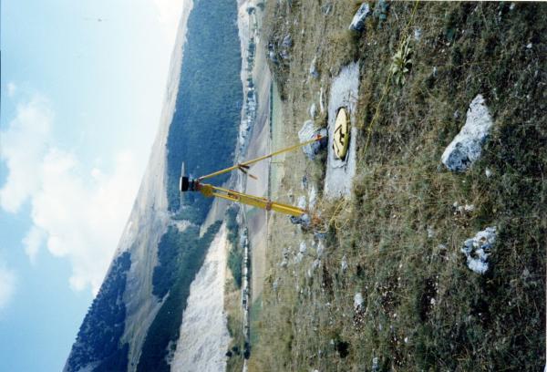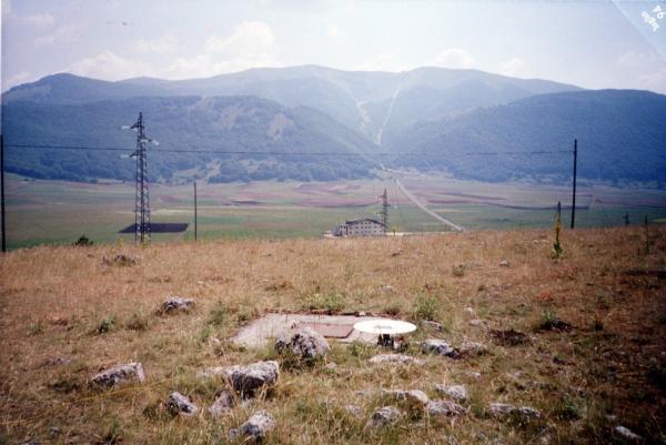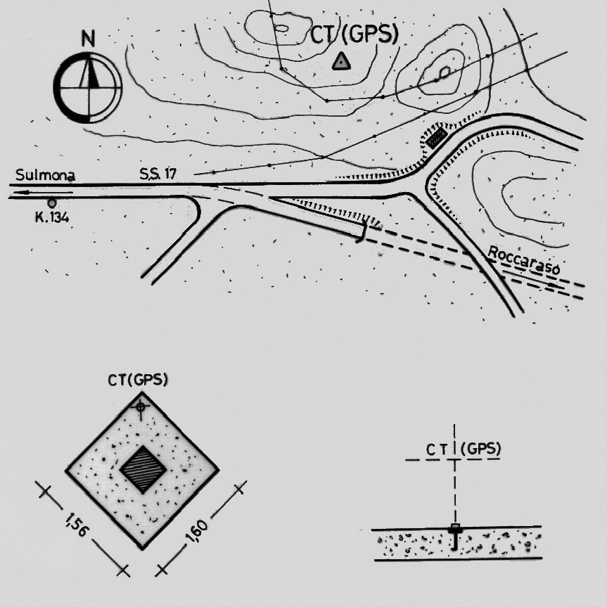 | materializzazione | Centrino di tipo "GPS A" fissato su preesistente centrino IGM cementato presso lo spigolo nord della soletta di copertura in cemento armato di un pozzetto dell'acquedotto comunale, a circa 300 m a nord-ovest del Santuario omonimo nell'insellatura fra due poggetti. |