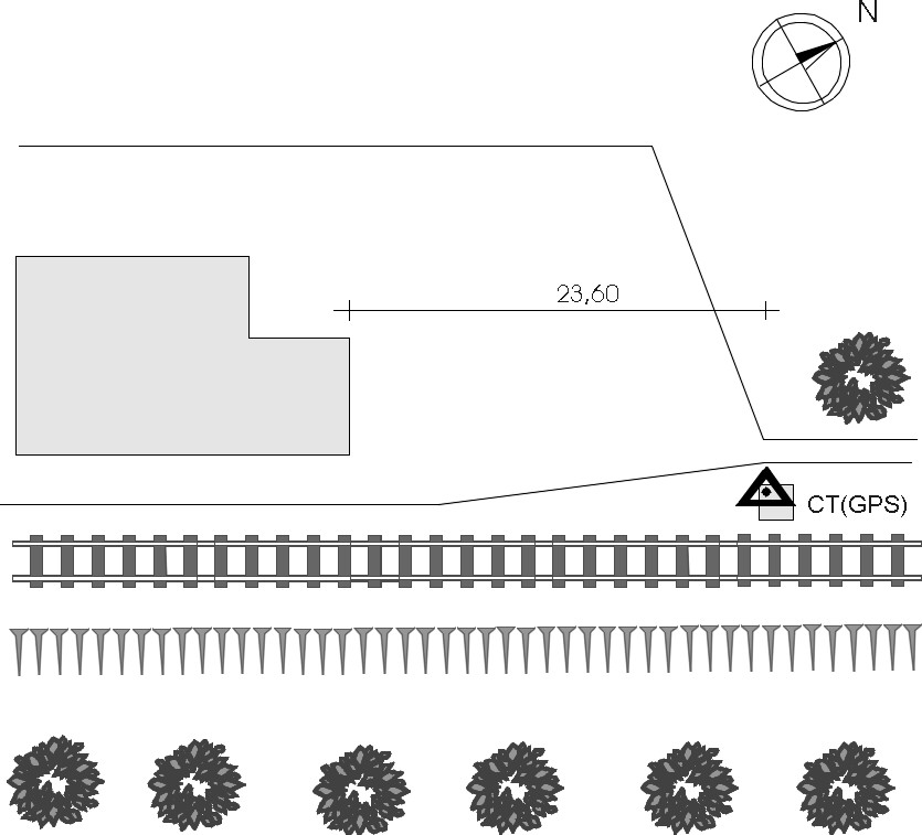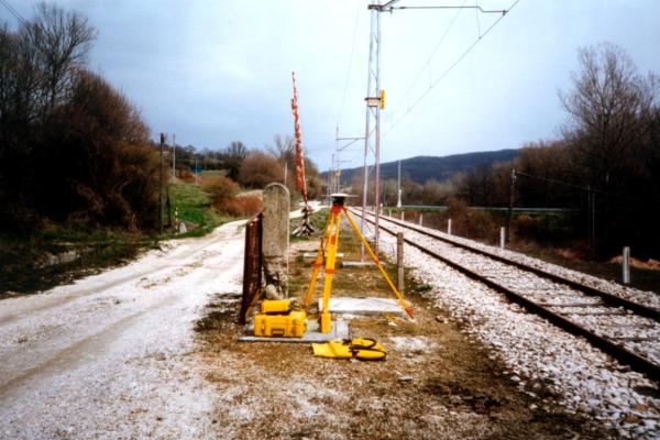 Centrino in acciaio inox del tipo "GPS da livellazione" infisso nel basamento di un palo della linea elettrica ubicato nei pressi della stazione ferroviaria.