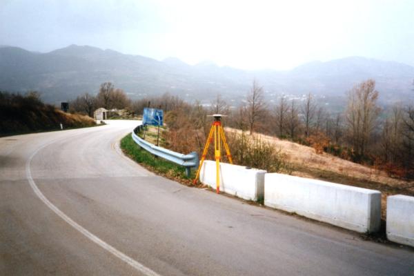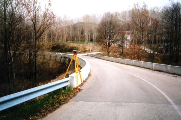 Centrino in acciaio inox del tipo "GPS da livellazione" infisso nella sommità dell'estremo ovest del blocco finale di quelli esistenti che costituiscono il parapetto a valle del ponte ubicato al km 22,200 della strada provinciale ex S.S. 558.