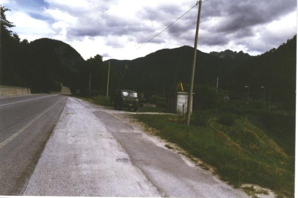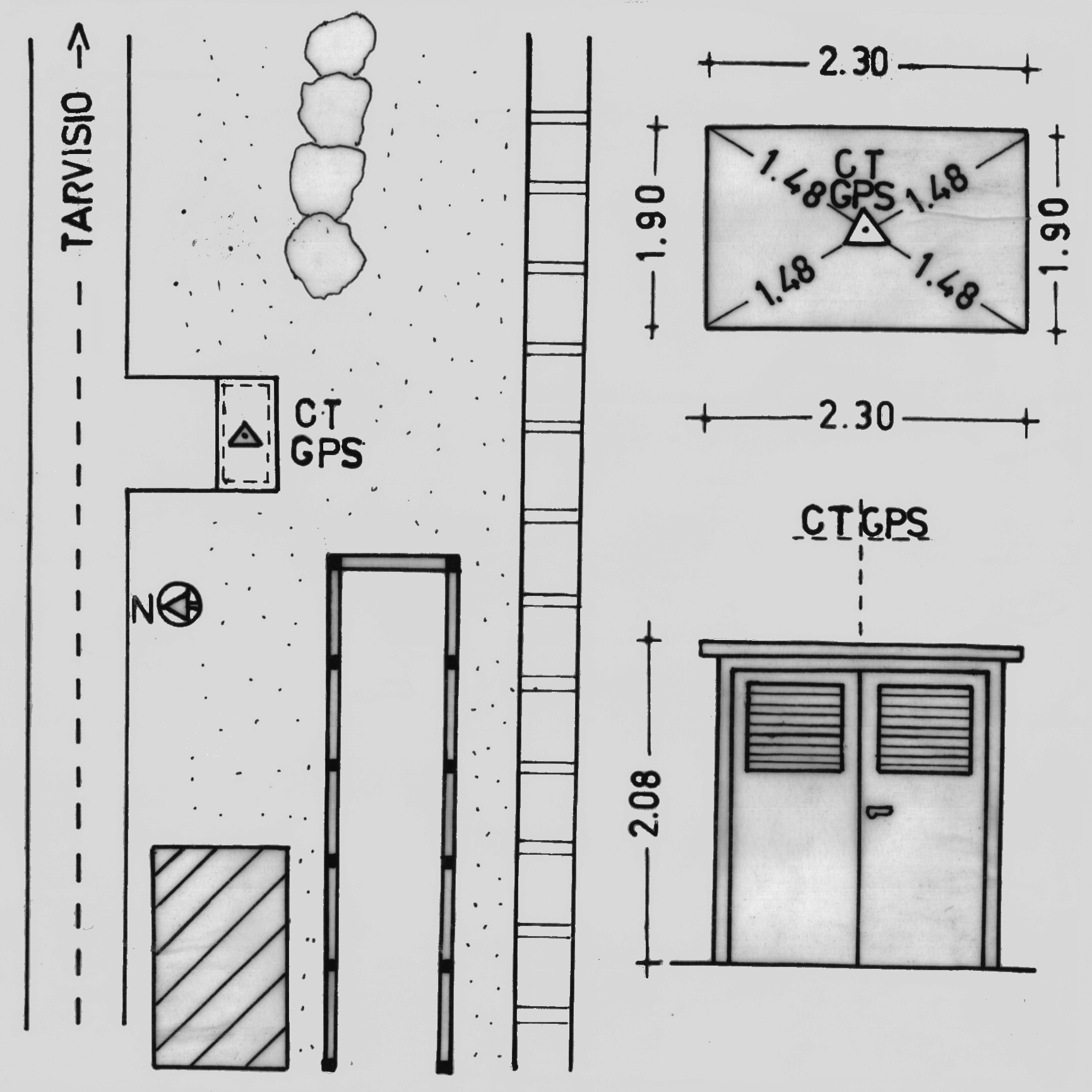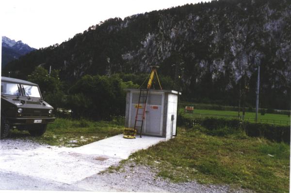 Centrino del tipo "GPS C" fissato al centro della soletta di copertura del casotto in cemento armato, adibito a stazione di riduzione del metano, posto alla periferia del paese di Ugovizza, adiacente alla S.S. 13.