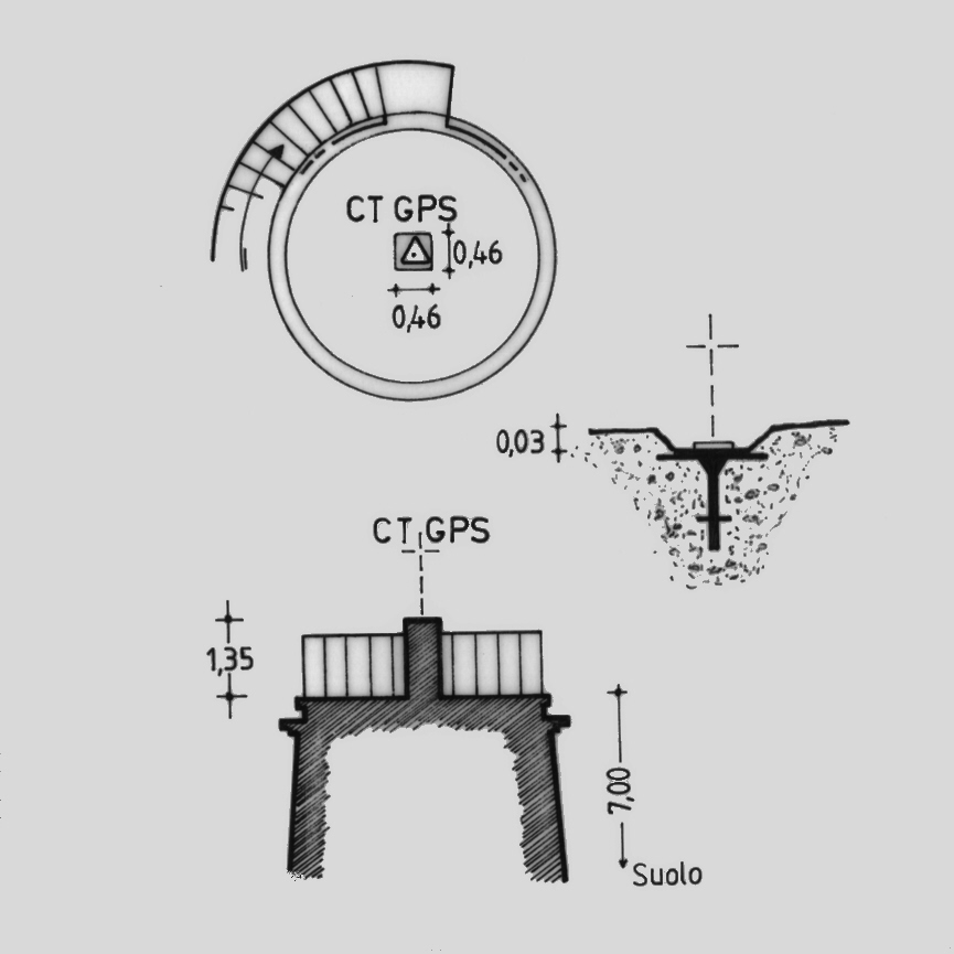 | materializzazione | Centrino del tipo "GPS A" fissato su preesistente centrino IGM di superficie, cementato alla sommità di un pilastrino, posto sulla terrazza di copertura, in corrispondenza dell'asse geometrico della torretta appositamente costruita. |