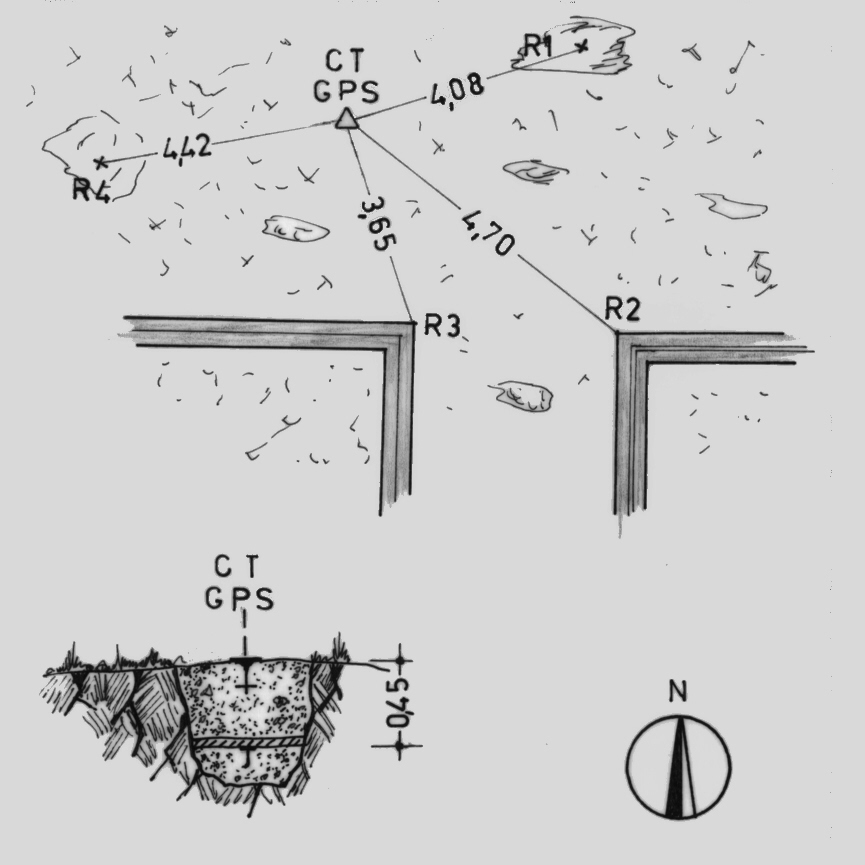 | materializzazione | Centrino del tipo "GPS A fissato su preesistente centrino IGM del tipo di superficie cementato a livello del suolo e sottostante centrino di profondità, siti alla sommità del monte. Riferimenti: R1; R4 croci incise su roccia. R2, R3 spigoli di recinzioni in cemento. |