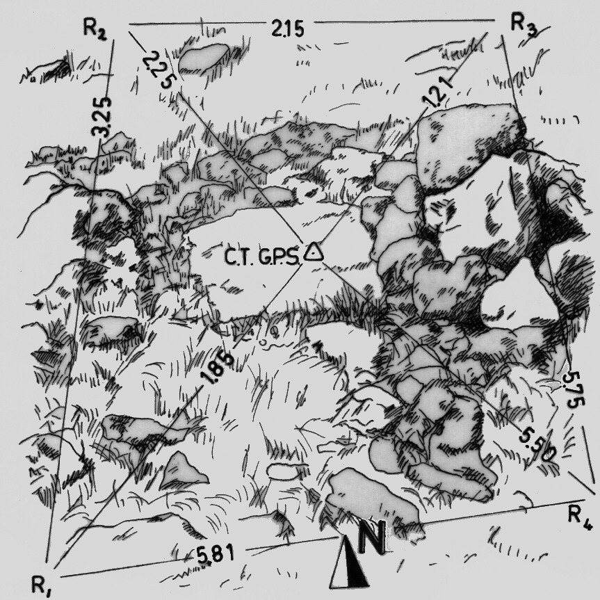 | materializzazione | Centrino di tipo "GPS A" fissato su preesistente centrino IGM del tipo di superficie, coassiale a sottostante centrino di fondo, cementato in un blocco di calcestruzzo, alla sommità del monte. Riferimenti: quattro centrini metallici come da schizzo monografico. |