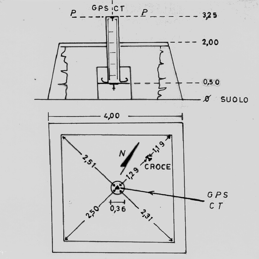 | materializzazione | Centrino di tipo "GPS A" fissato alla sommità del centrino di superficie cementato in asse al pilastrino cilindrico in muratura eretto su un basamento tronco piramidale in pietrame posto alla sommità del Monte Zappi. |