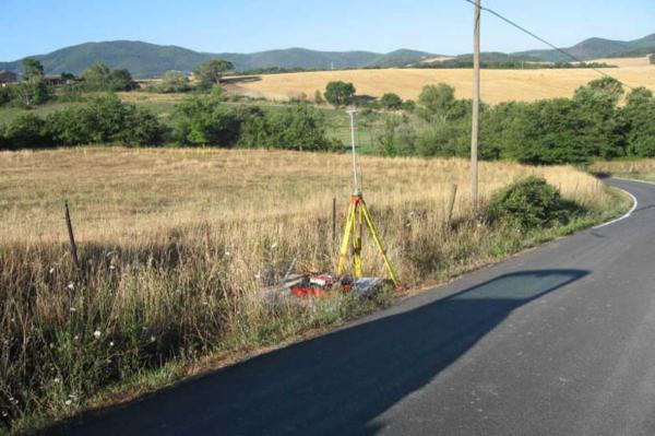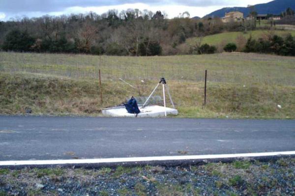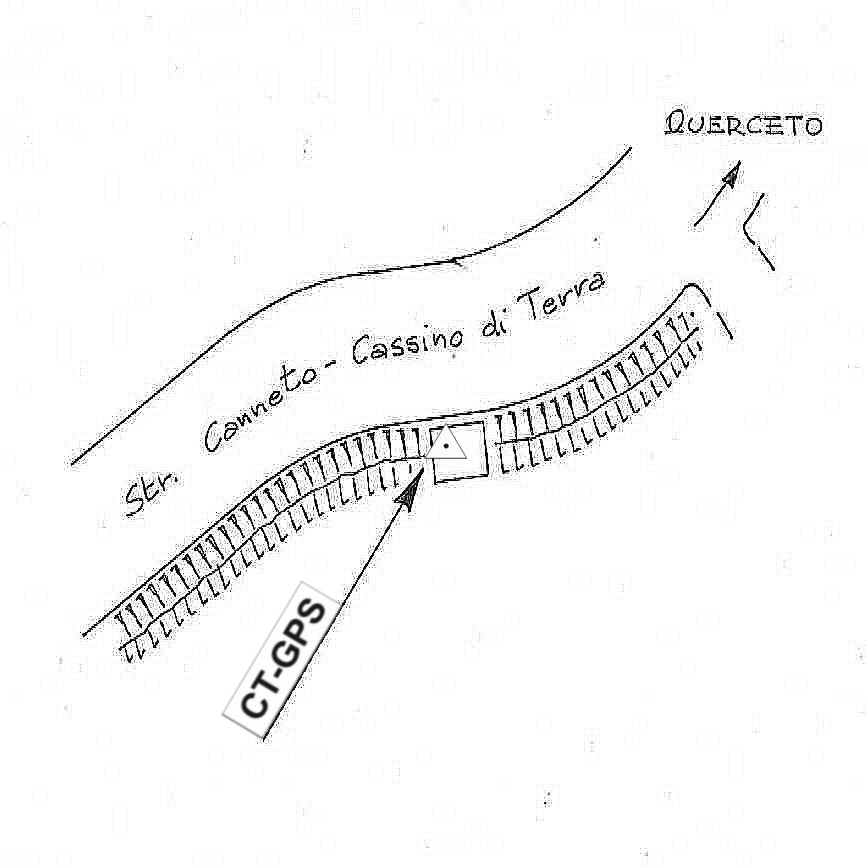| materializzazione | Centrino in acciaio inox murato vicino ad uno spigolo della copertura in cemento armato del tombino posto a destra della strada verso Querceto nel comune di Montecatini Val di Cecina. |