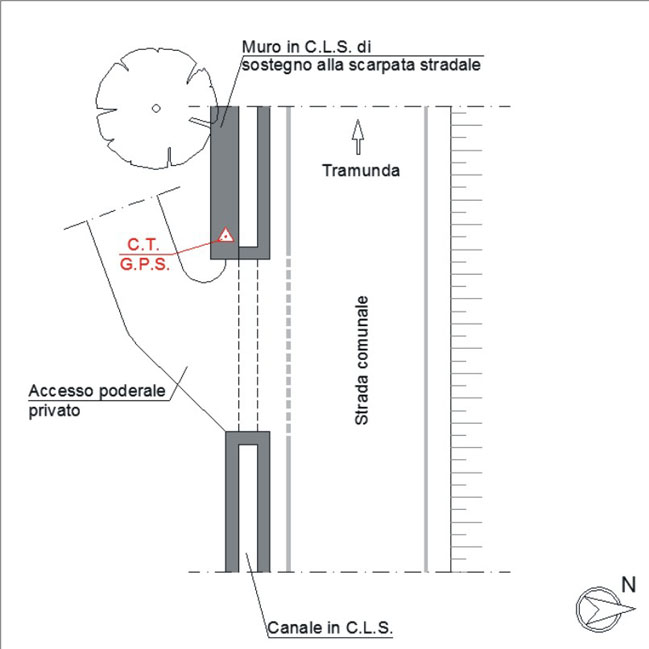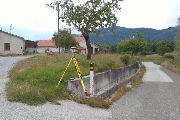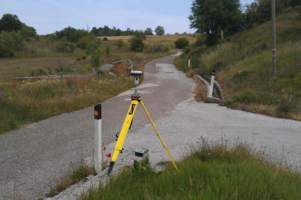 Centrino metallico orizzontale di tipo chiodo con rondella ARPAB Regione Basilicata infisso sulla sommità del muro in C.L.S. di sostegno scarpata strada.