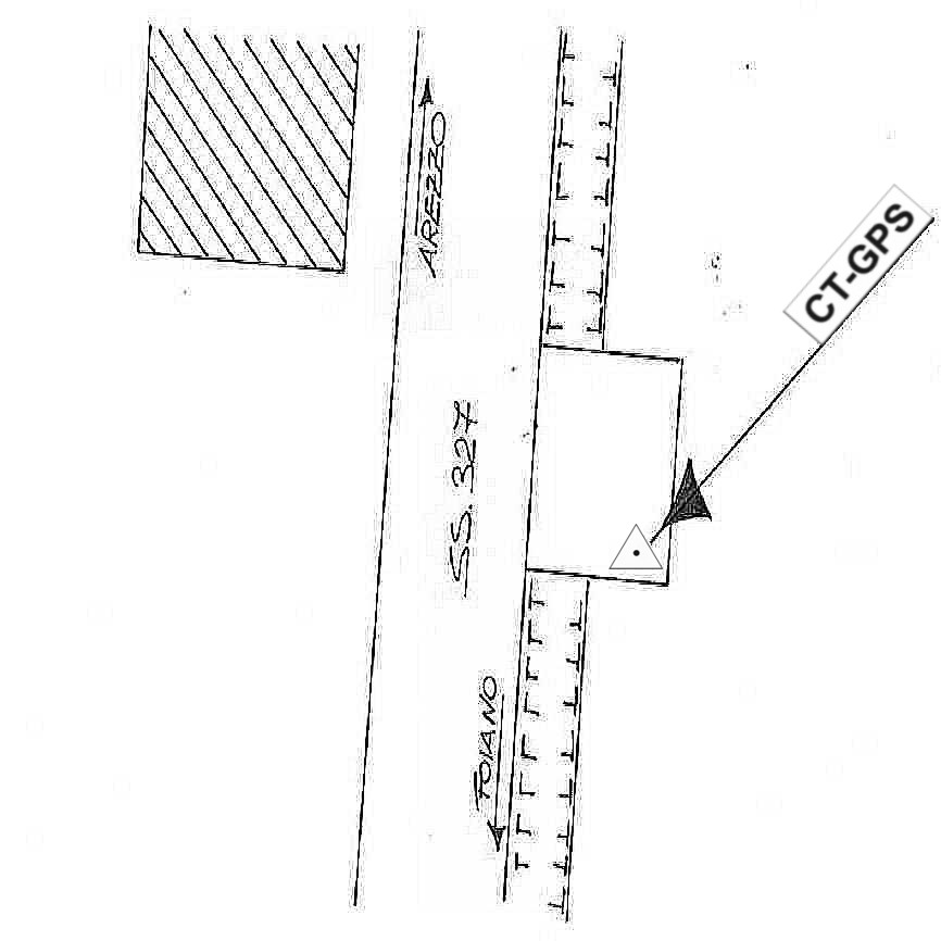 | materializzazione | Centrino inox murato in prossimità dello spigolo Sud-Est di una platea in cemento di accesso ad una pesa, situato sulla strada S.S. 327 al Km 8 + 850, in prossimità della frazione Montignano comune di Monte San Savino. |
