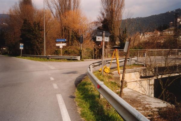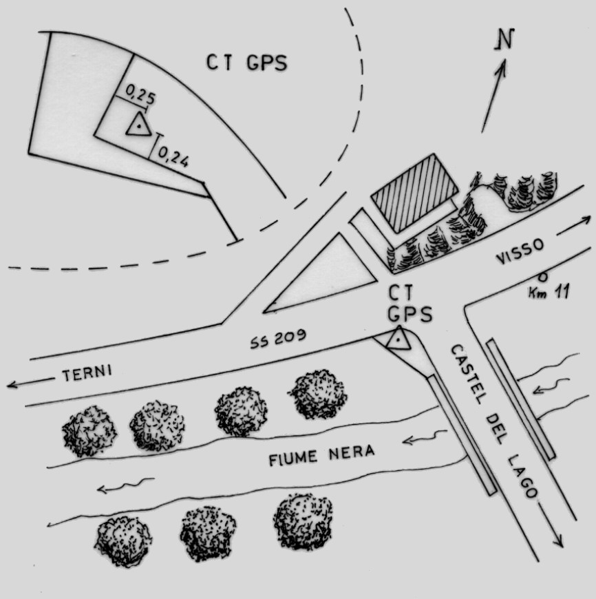 | materializzazione | Centrino in accaio inox del tipo "GPS da livellazione" infisso nella spalla in cemento armato, lato a valle, riva destra, del ponte esistente all'imbocco della deviazione per Castel del Lago. |