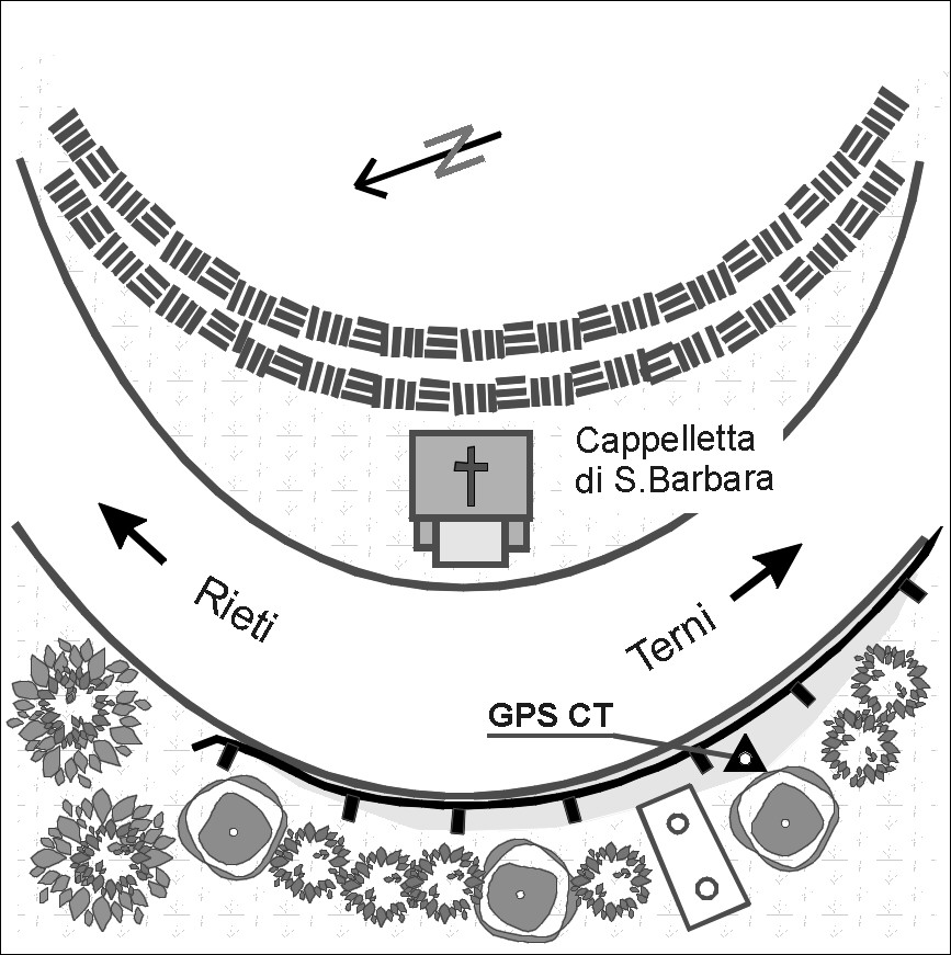 | materializzazione | Centrino del tipo "GPS C" infisso nel cordolo alla sommità del muro di sostegno esistente sul lato sinistro della strada in direzione di Rieti, nelle immediate vicinanze della Cappelletta di S.Barbara. |