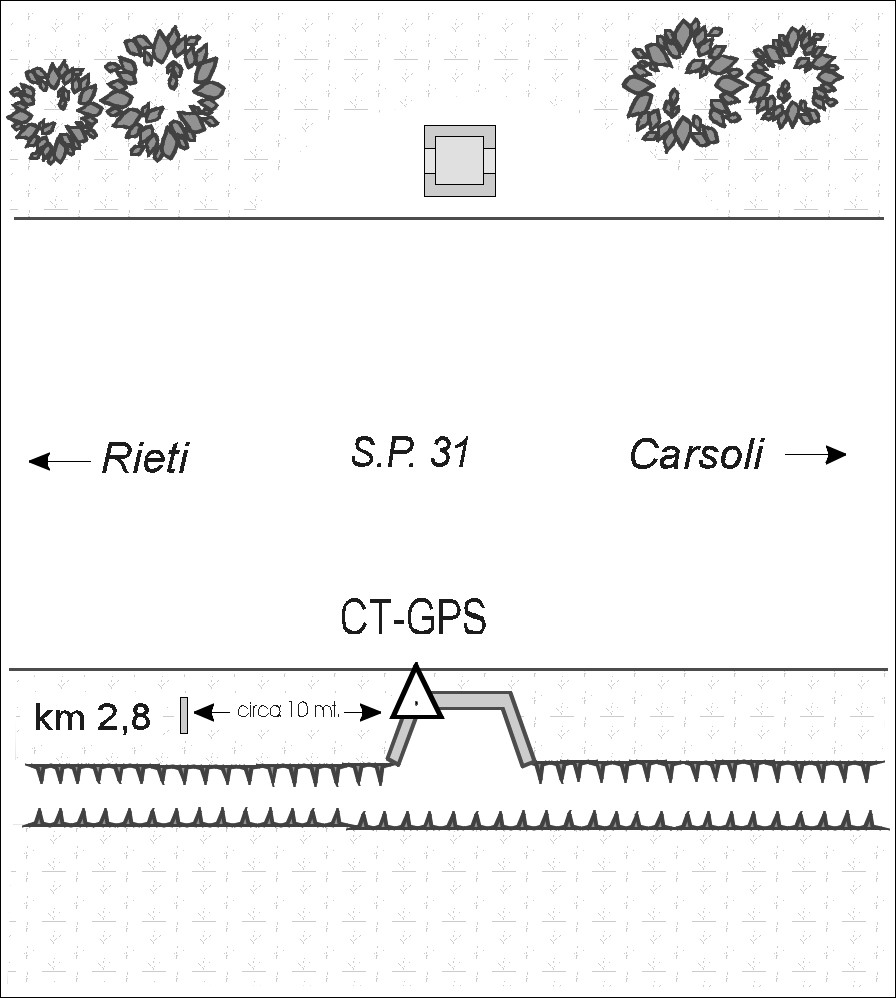 | materializzazione | Centrino del tipo "GPS C" infisso sul cordolo in cemento armato della chiavica a valle esistente a lato della strada provinciale che da Rieti conduce a Carsoli. |