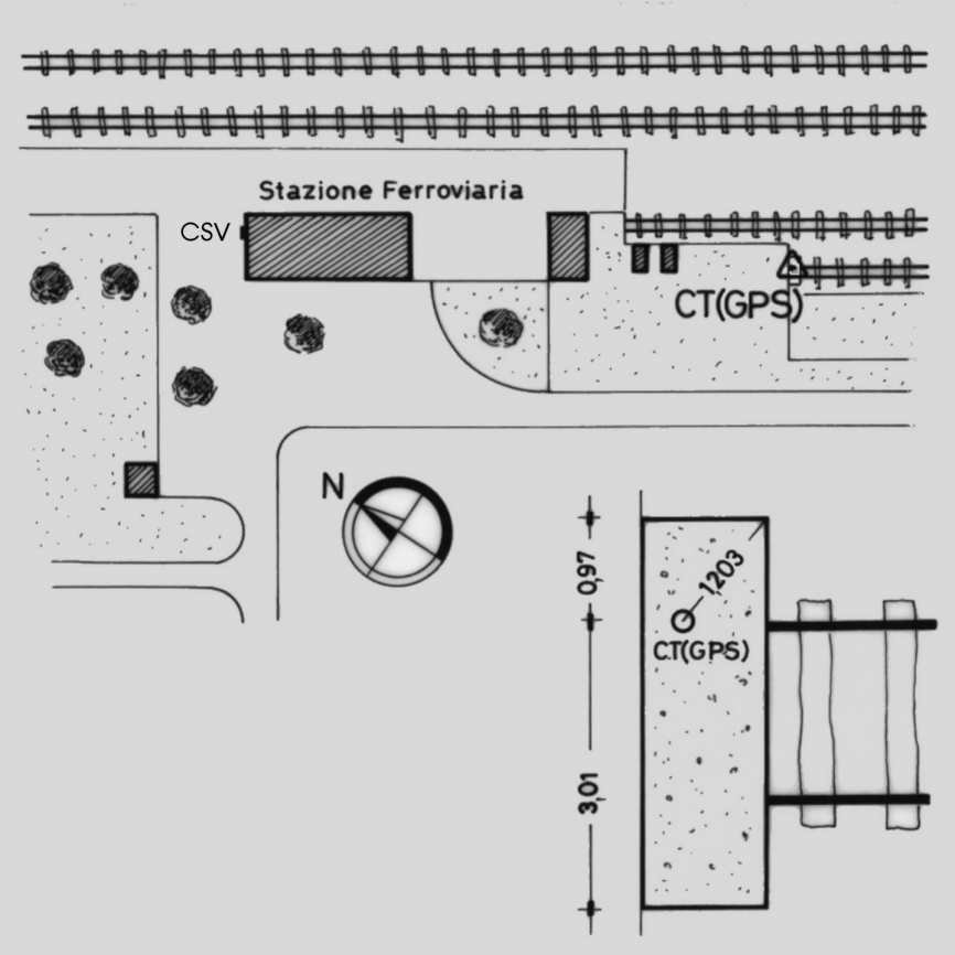 | materializzazione | Centrino del tipo "GPS C" fissato alla sommità di un blocco di calcestruzzo posto al termine di un binario. |