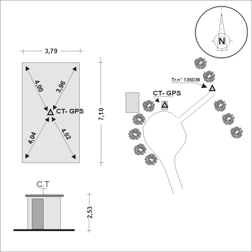 | materializzazione | Centrino del tipo "GPS C" fissato sulla soletta di copertura, in corrispondenza con l'asse geometrico, del deposito idrico posto alla sommità del poggio omonimo. |