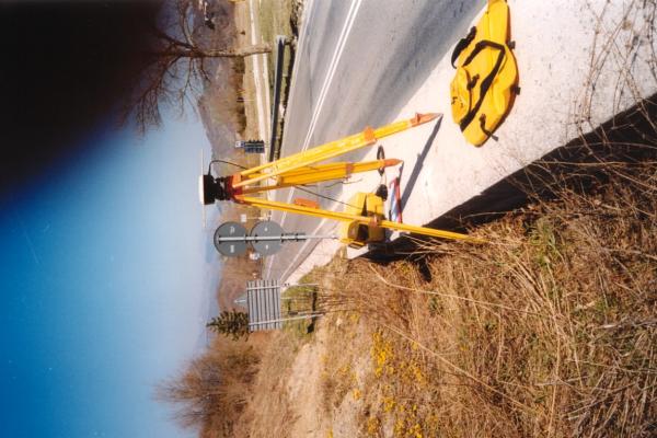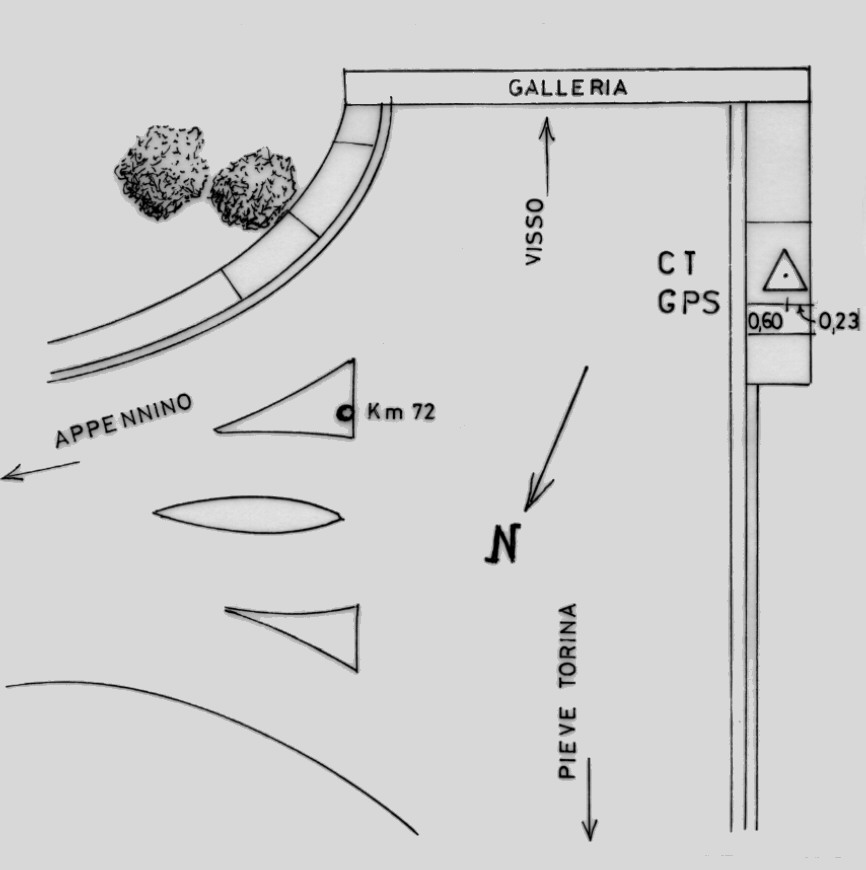 Centrino in acciaio inox del tipo "GPS da livellazione" infisso alla sommità del muro di contenimento in cemento armato esistente, prima dell'imbocco della galleria, sul lato destro della carreggiata procedendo in direzione di Visso.