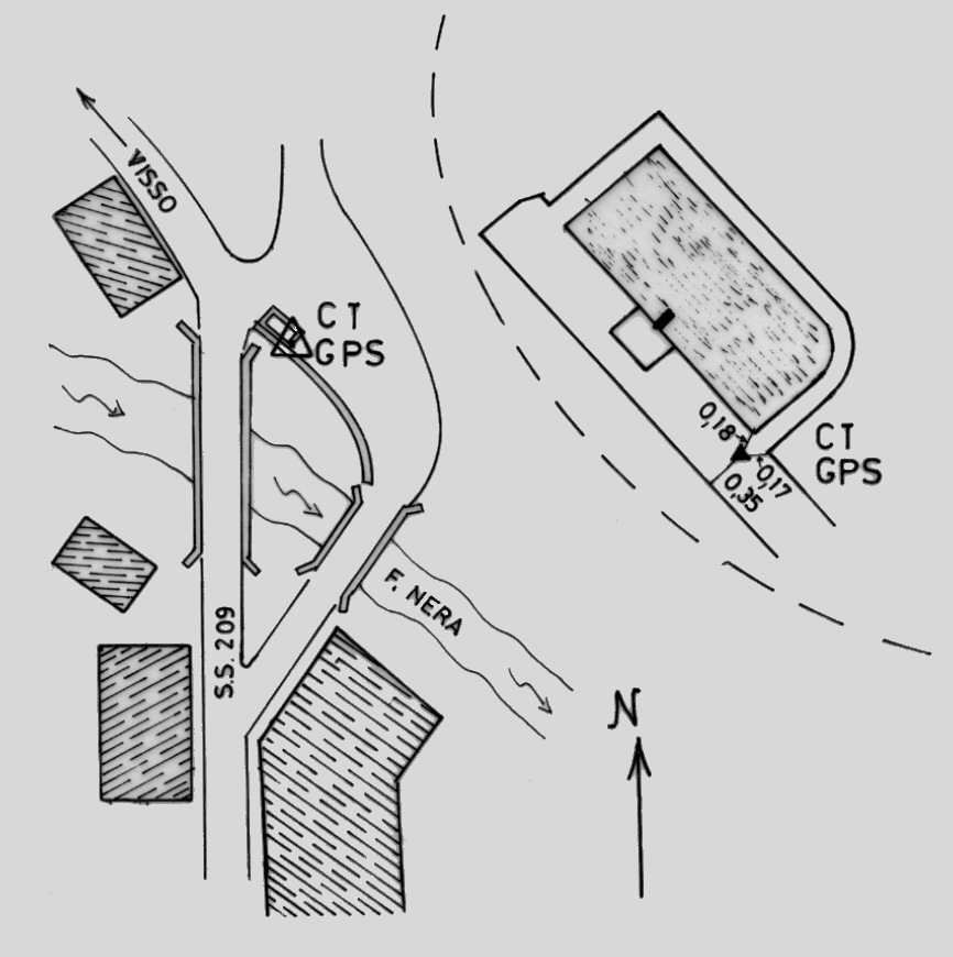 | materializzazione | Centrino in acciaio inox del tipo "GPS da livellazione" infisso nel basso parapetto in cemento del vecchio ponte sul Fiume Nera, in corrispondenza della fontana, al km 48,600 della S.S. 209. |