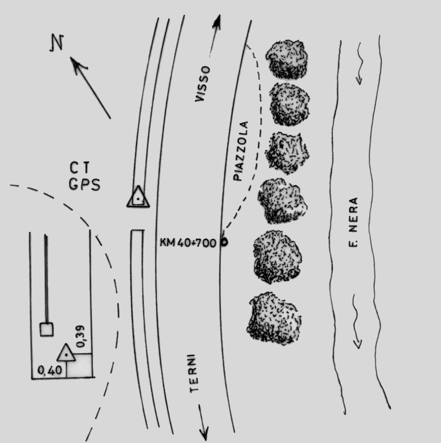 | materializzazione | Centrino in acciaio inox del tipo "GPS da livellazione" infisso alla sommità del muro in cemento armato di contenimento alla scarpata al km 40,700 della S.S. 209. |