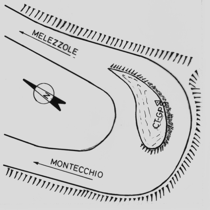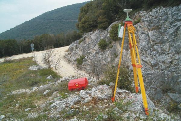 Centrino di tipo "GPS C" infisso su roccia affiorante su di un costone che divide la strada sterrata che collega Montecchio con Melezzole.