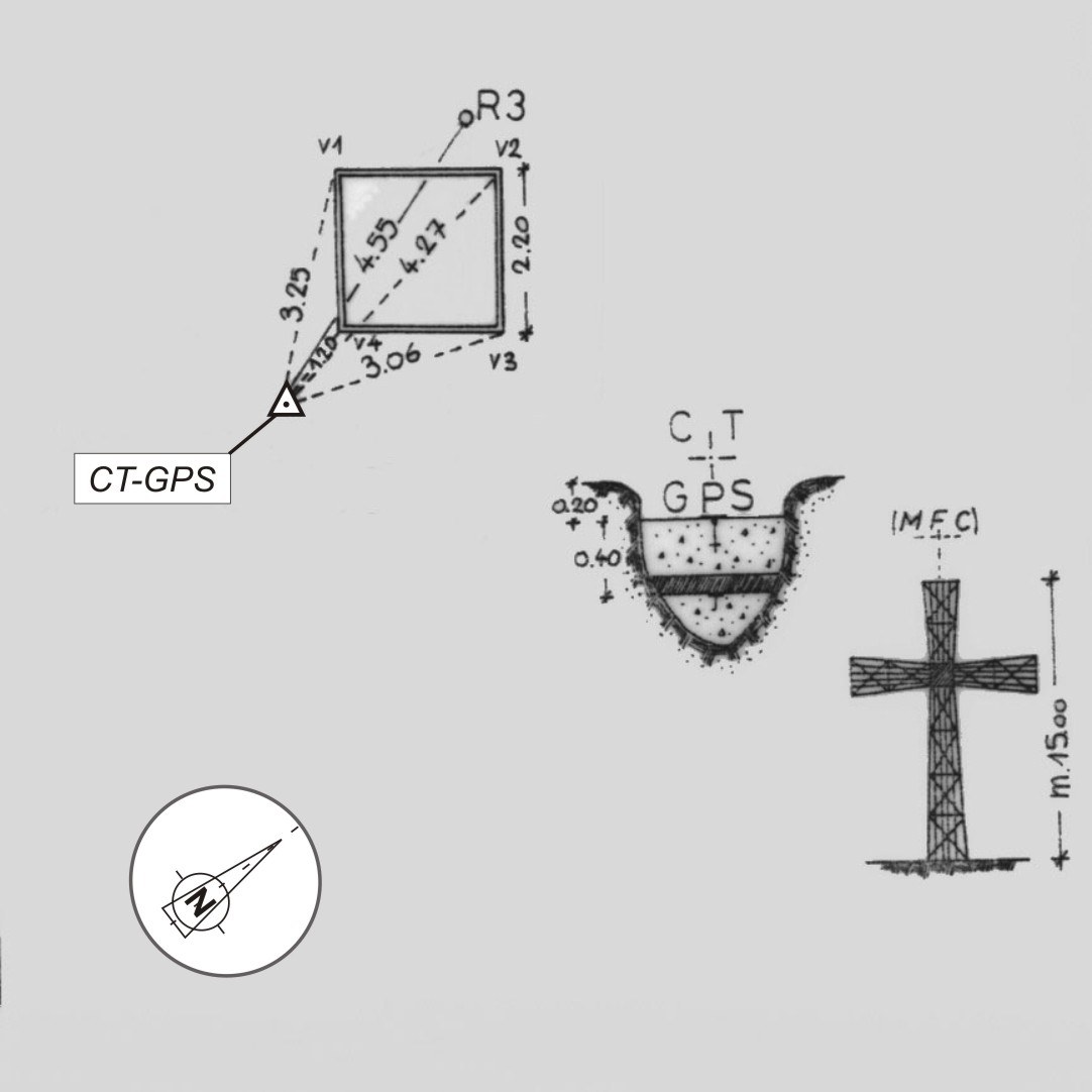 Centrino IGM del tipo di superficie cementato in blocco di calcestruzzo, con sottostante centrino di fondo coassiale, posto alla sommità del monte omonimo. Riferimenti: R3 (centrino metallico cementato su roccia affiorante); V1, V2, V3 (vertici basamento croce).