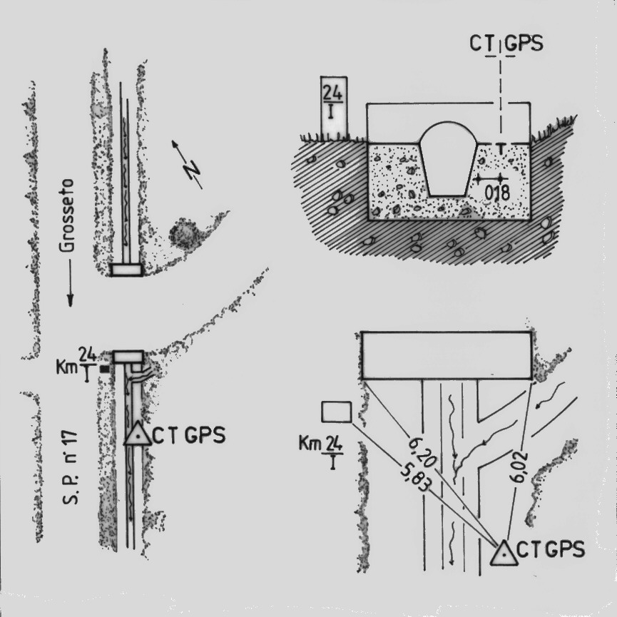 | materializzazione | Centrino del tipo "GPS C" fissato alla sommità del bordo del fossato in calcestruzzo armato, che corre di fianco alla S.P. 17. |