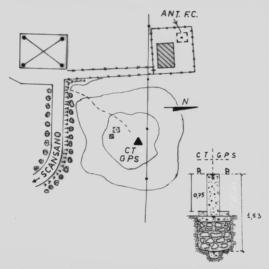 | materializzazione | Centrino del tipo "GPS A" fissato su preesistente centrino IGM cementato alla sommità di un pilastrino in calcestruzzo di forma cilindrica con sottostanti centrini di fondo coassiali, posto sull'altura omonima, ad est dell'antenna SIP. |