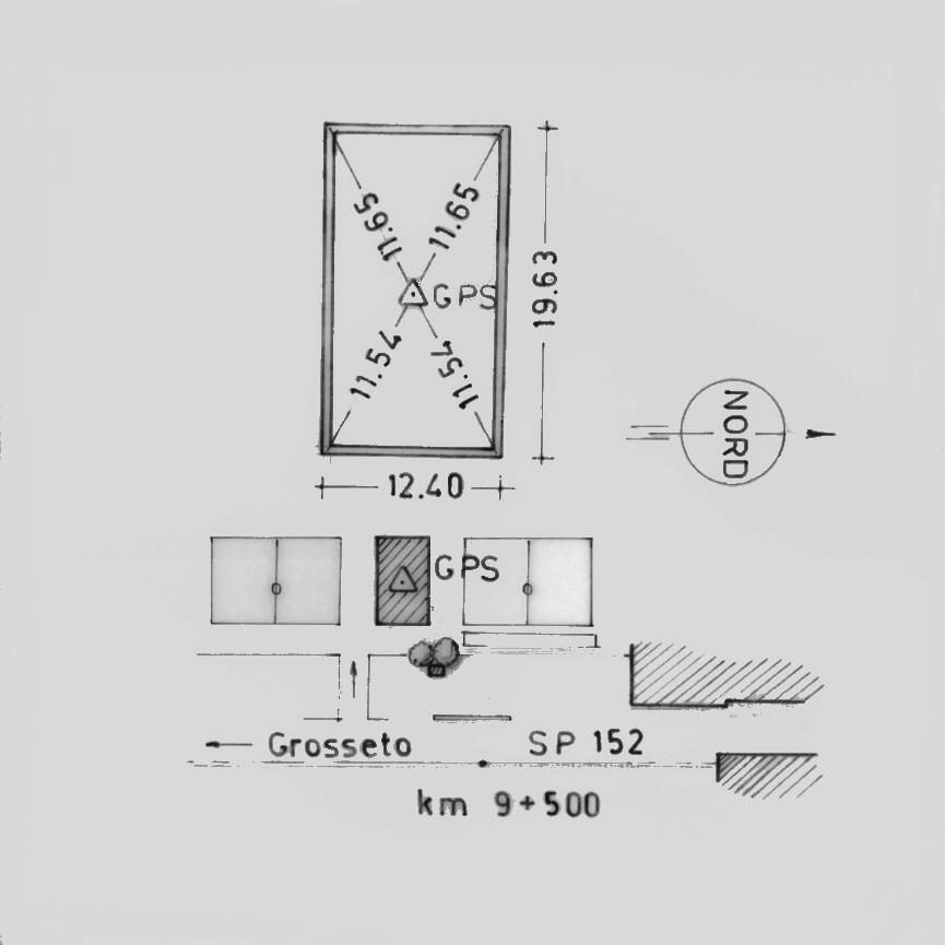 | materializzazione | Centrino del tipo "GPS C" infisso nella sommità, in corrispondenza del centro geometrico, della soletta di copertura del fabbricato adibito a spogliatoio del complesso sportivo di Braccagni. |