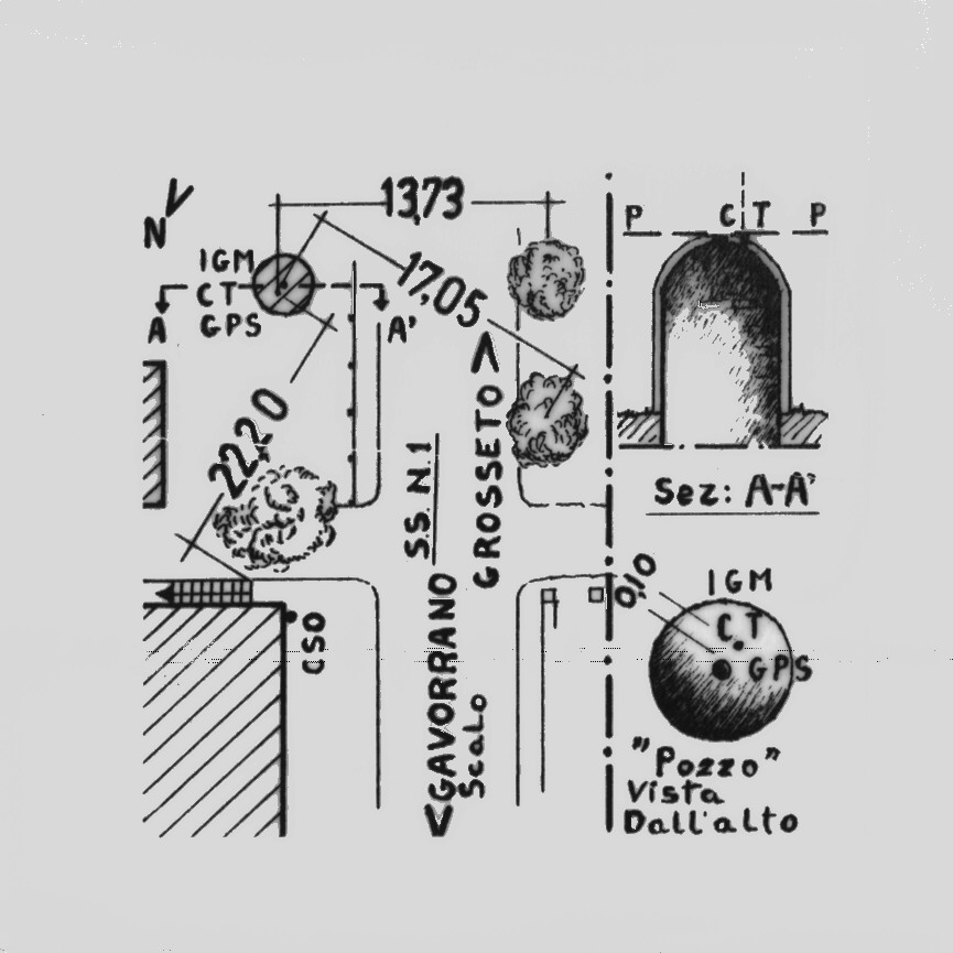 | materializzazione | Centrino del tipo "GPS C" fissato alla sommità del pozzo in muratura ubicato all'altezza del km 212,338 sulla SS.1. |