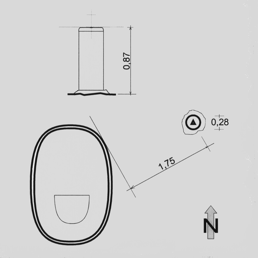 | materializzazione | Centrino di zinco senza alcuna dicitura infisso su pilastrino cilindrico in cemento, in corrispondenza del suo asse geometrico; il pilastrino è adiacente ai ruderi di una vecchia postazione militare. |