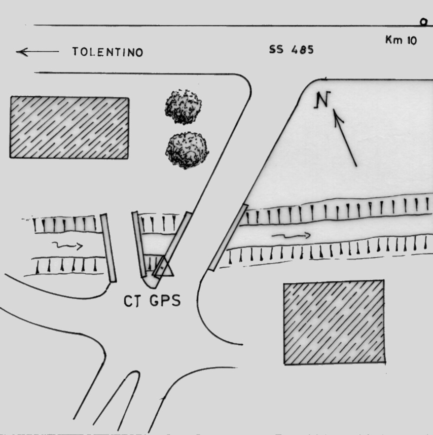 | materializzazione | Centrino in acciaio inox del tipo "GPS da livellazione" infisso nella soletta in cemento armato del ponticello, più ad est dei due esistenti, che attraversa il canale di bonifica, nei pressi del km 10,050 della S.S. 485, in località Molinetto. |