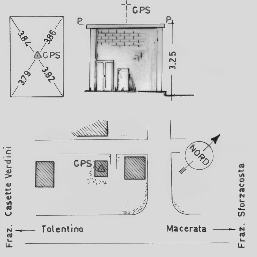 | materializzazione | Centrino del tipo "GPS C" fissato alla sommità, in posizione pressochè centrale, della soletta in cemento a copertura della cabina ENEL. |